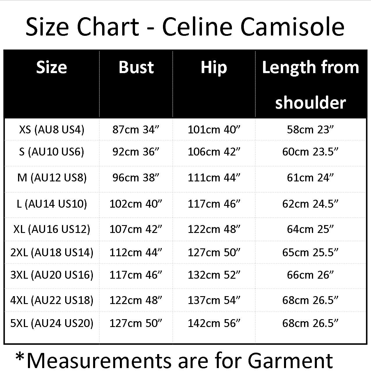 * Please note measurements are for the GARMENT - See images for Size Chart