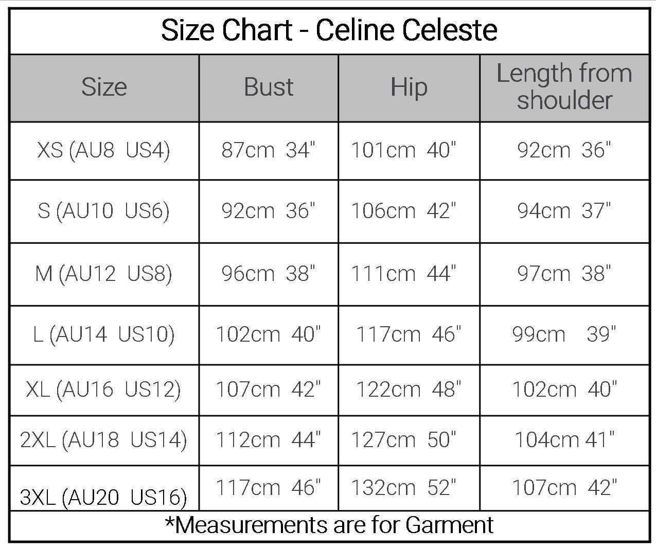 XS (AU 8) US4 Bust 87cm 34" Hip 101cm 40″ Length 92cm 36"