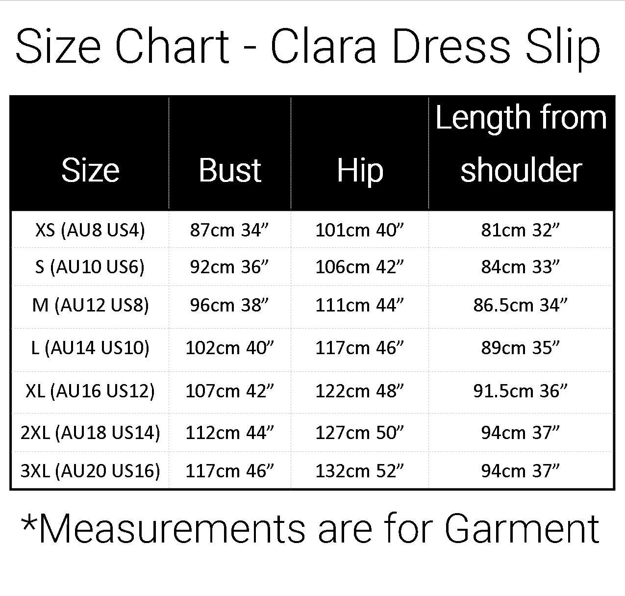 2XL (AU 18)US14 Bust 110cm 44" Hip 120cm 50" Length 94cm 37"