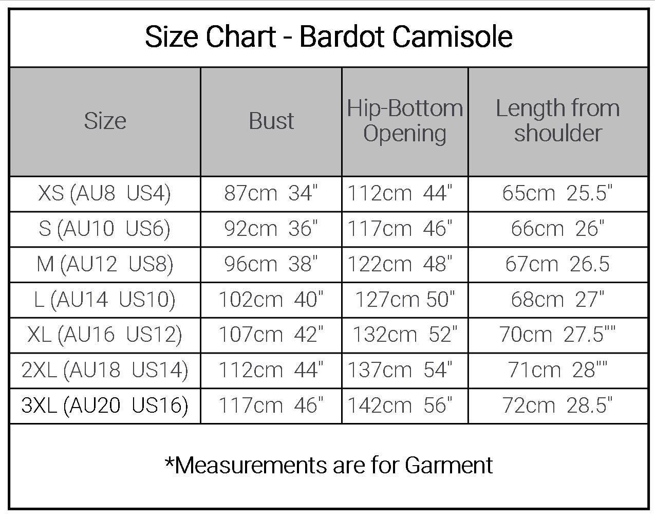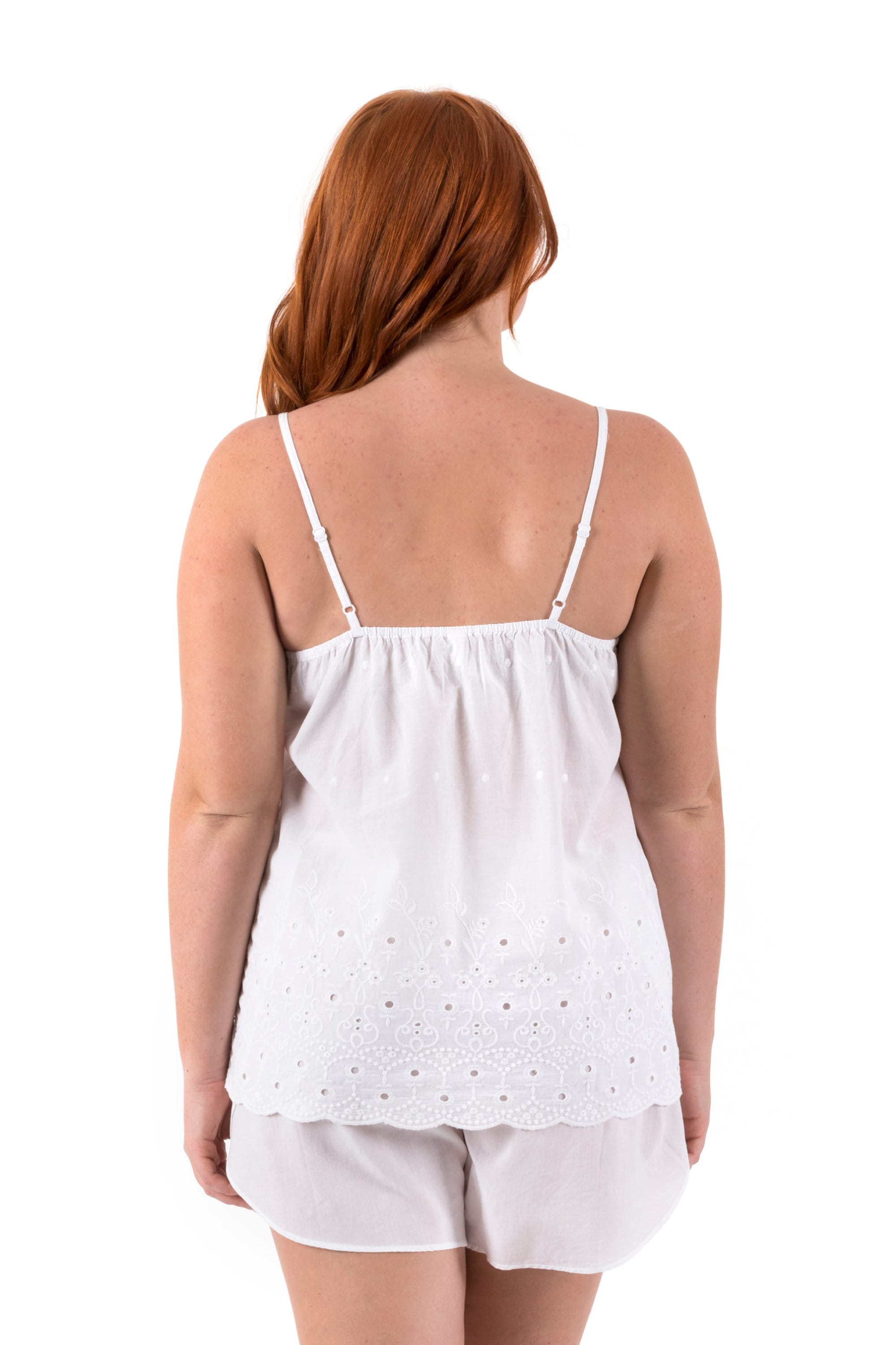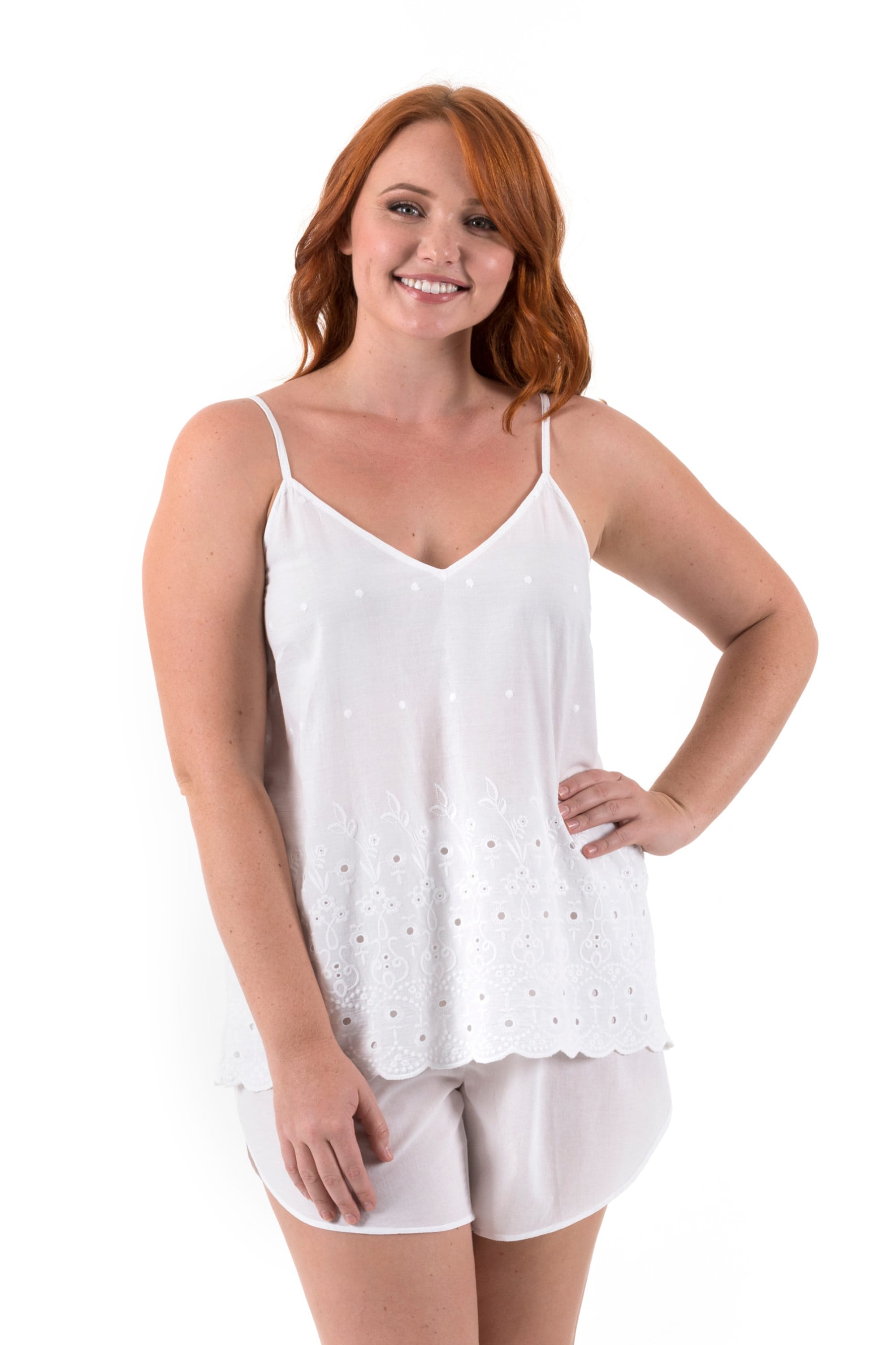 Our Bardot Camisole is the same lovely Broderie Anglaise fabric as our Chloe Celeste Slip Dress featuring embroidery and cut-work giving this camisole a lovely lacy border around the hemline. We like to call it the "Temple pattern".