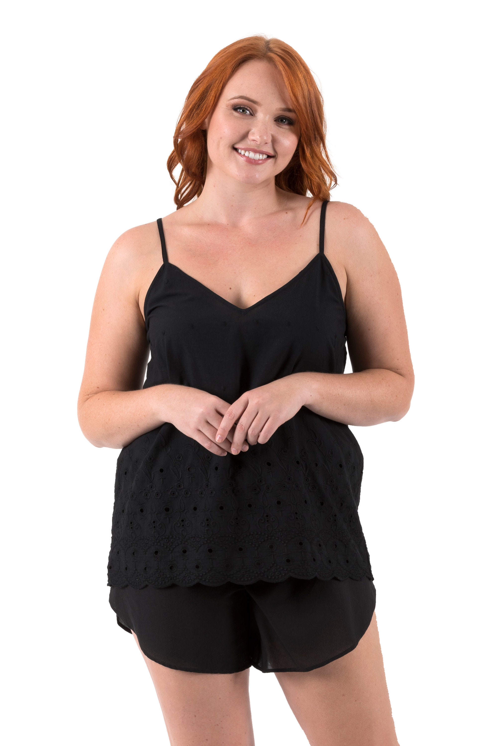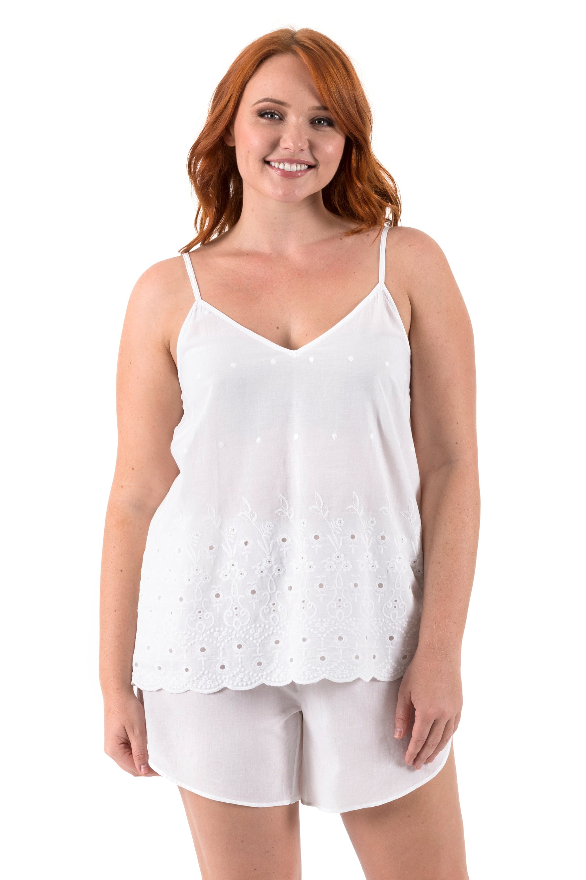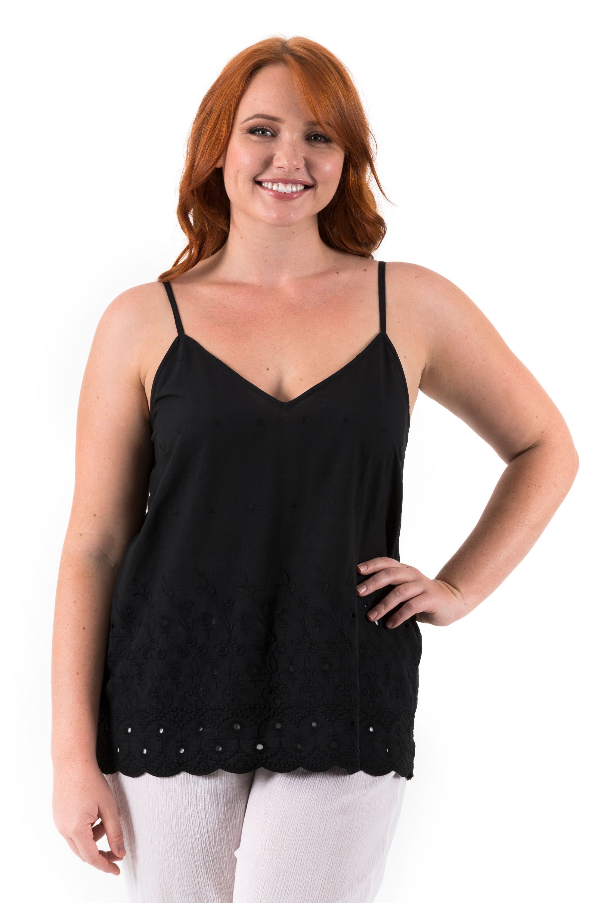 Our Bardot Camisole is the same lovely Broderie Anglaise fabric as our Chloe Celeste Slip Dress featuring embroidery and cut-work giving this camisole a lovely lacy border around the hemline. We like to call it the "Temple pattern".